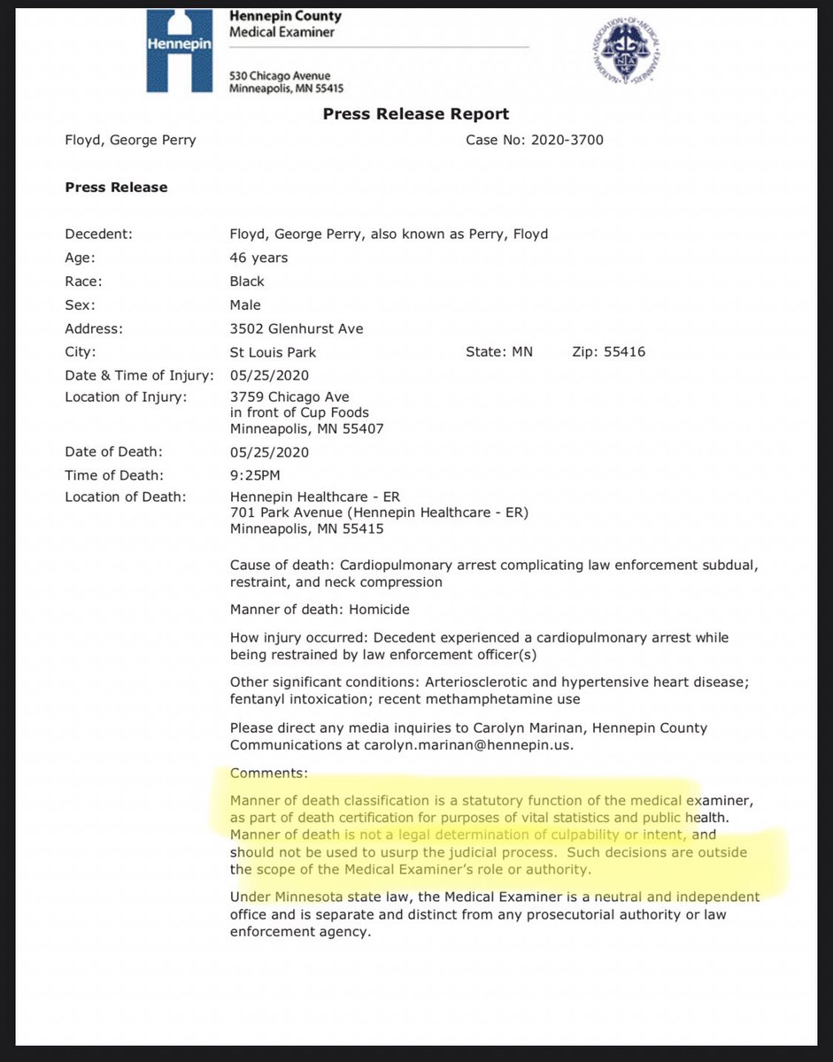 Manner of death is merely a classification, it is not the same as-nor a determination of- what people think of as the legal definition of “homicide” See for example the ME disclaimer on the George Floyd reportpic.twitter.com/xcdFOwJUPv
