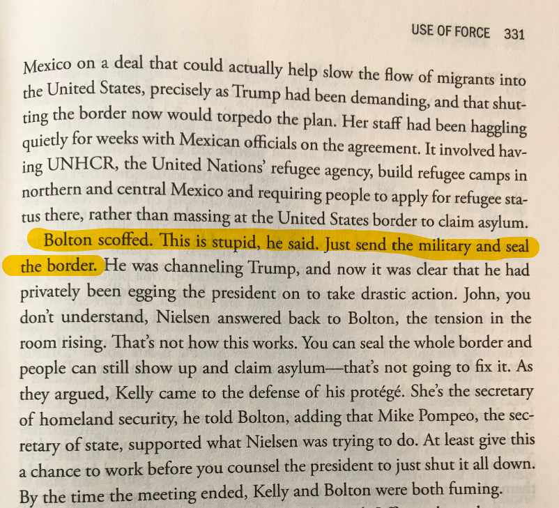 The man in charge of US foreign policy, then NSC Director John Bolton, loudly argued for a patently illegal military-enforced border closure. "Bolton scoffed. This is stupid, he said. Just send the military and seal the border." 5/pic.twitter.com/2n1GJG8jfV