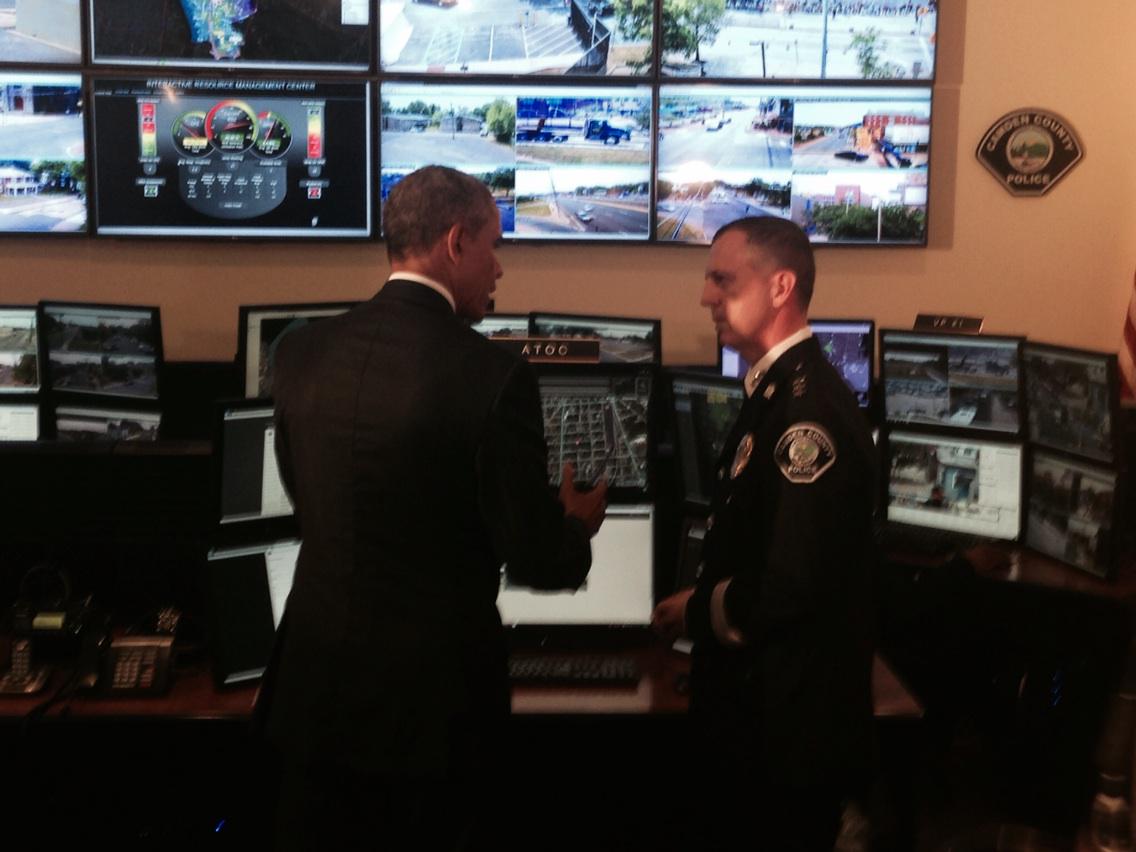 Obama confers w Camden police chief & tours Real-Time Tactical Operational Intel Ctr where police surveil citypic.twitter.com/NM2AwUgnwQ