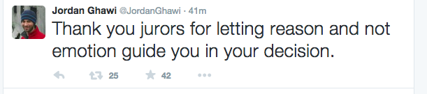 Mixed reaction to Holmes decision. Msg below from @JordanGhawi, brother of victim and budding reporter Jessica.pic.twitter.com/Bg4NxDtuTZ