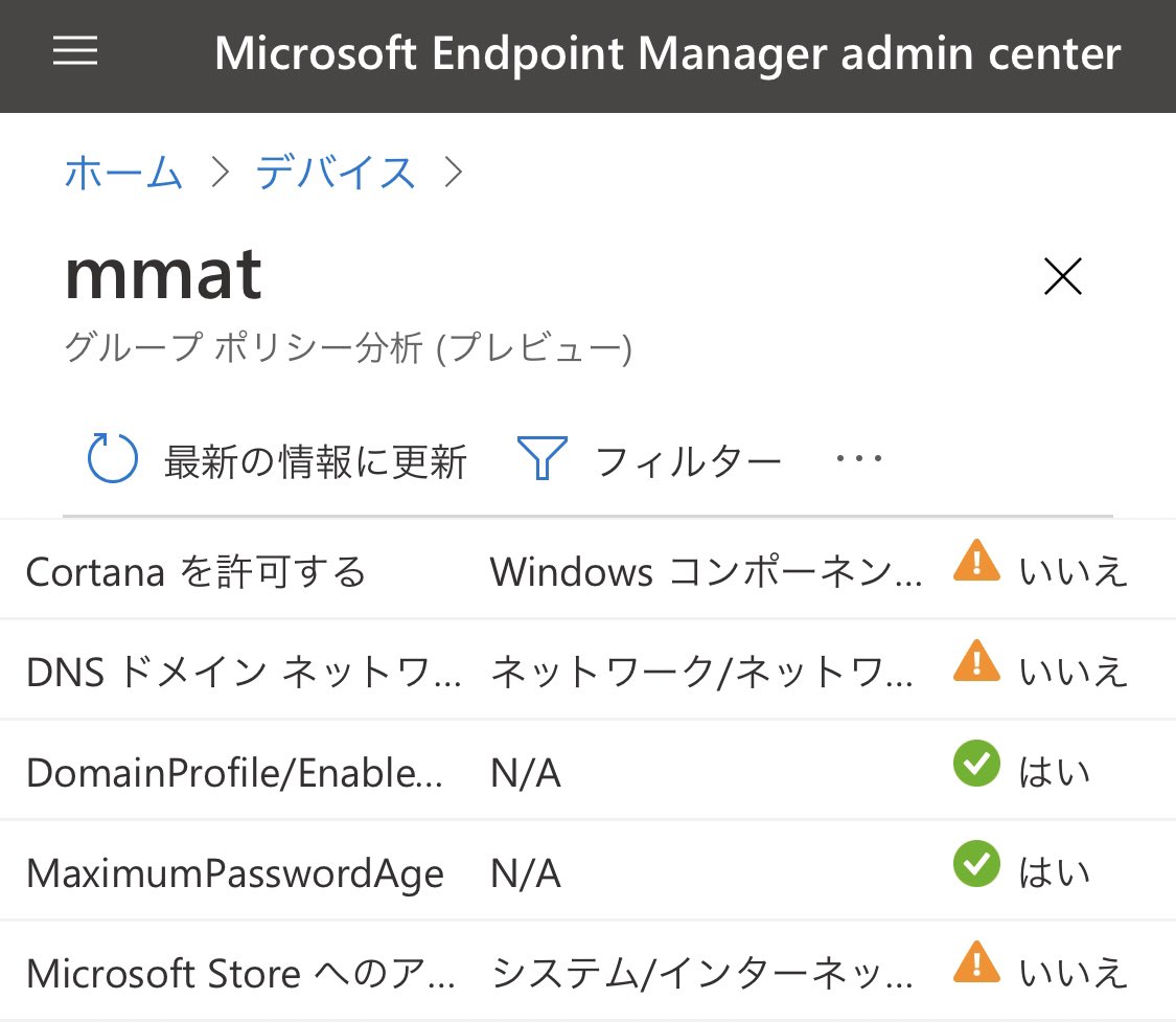 Intune のグループポリシー移行分析(プレビュー)が便利すぎる。AD から GPO エクスポートして Intune にインポートするだけで移行可能か分析できるから、MMAT みたいにクライアントにポリシー適用させたり、RSAT インストールする必要もなく、GPO 単位で移行分析出来る。便利。。。pic.twitter.com/2UNo5VUDDC