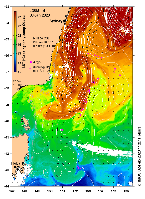 Are we seeing another Tasman Sea marine heatwave develop? Closer to Australia, the East Australian Current extension is moving 'hot' water southward toward Tasmania. From IMOS OceanCurrent - 30 Jan 2020.pic.twitter.com/KqNWoWzBav