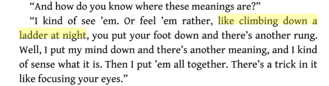 Farder Coram: “And how do you know where these meanings are?” Lyra: “I kind of see ‘em, like climbing down a ladder at night, you put your foot down and there’s another rung. Well, I put my mind down and there’s another meaning... There’s a trick in it like focusing your eyes.”pic.twitter.com/xfcl5eiZMJ