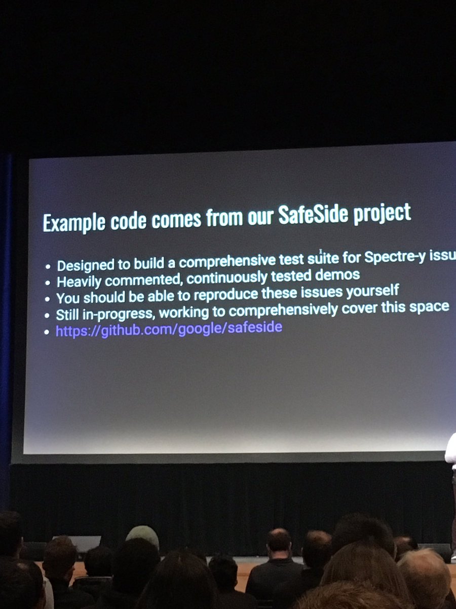@RealWorldCrypto might be the most mind-blowing attack I’ve ever seen. Use micro-architectural side channel attacks to infer secret RSA key, stealthly across servers if they share key. Packed room.pic.twitter.com/llSL6kmRoF