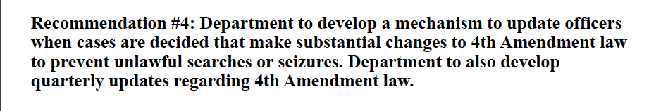 Recommendation #4: Department to develop a mechanism to update officers when cases are decided that make substantial changes to 4th Amendment law to prevent unlawful searches or seizures. Department to also develop quarterly updates regarding 4th Amendment law.pic.twitter.com/7Al4N3EpcN