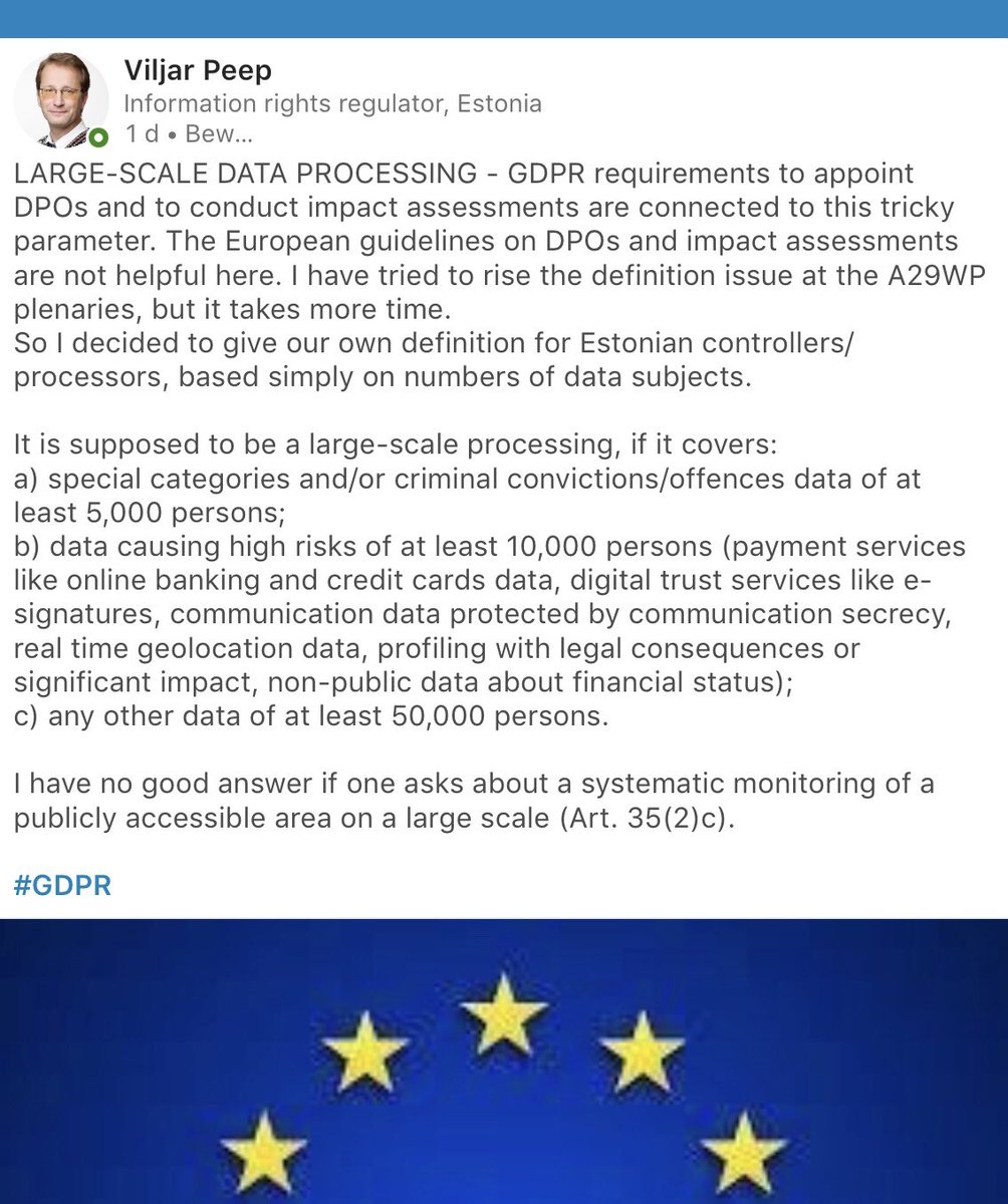 For clarity reasons and in the absence of pan-European guidance, the Estonian DPA has put numbers on ‘large scale data processing’, one of three criteria for appointing a