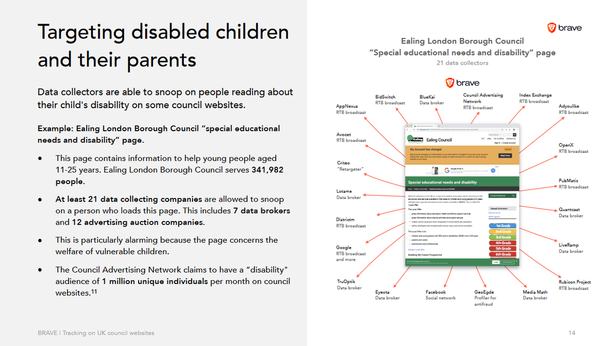@Brave finds that 400+ local authorities in the UK allow third parties to track people who visit their sites, including when they seek help with a benefit claim or with a disability. Council websites share data with up to 25 data companies: https://www.theguardian.com/technology/2020/feb/04/councils-let-firms-track-visits-to-webpages-on-benefits-and-disability …pic.twitter.com/48BOGJllgO