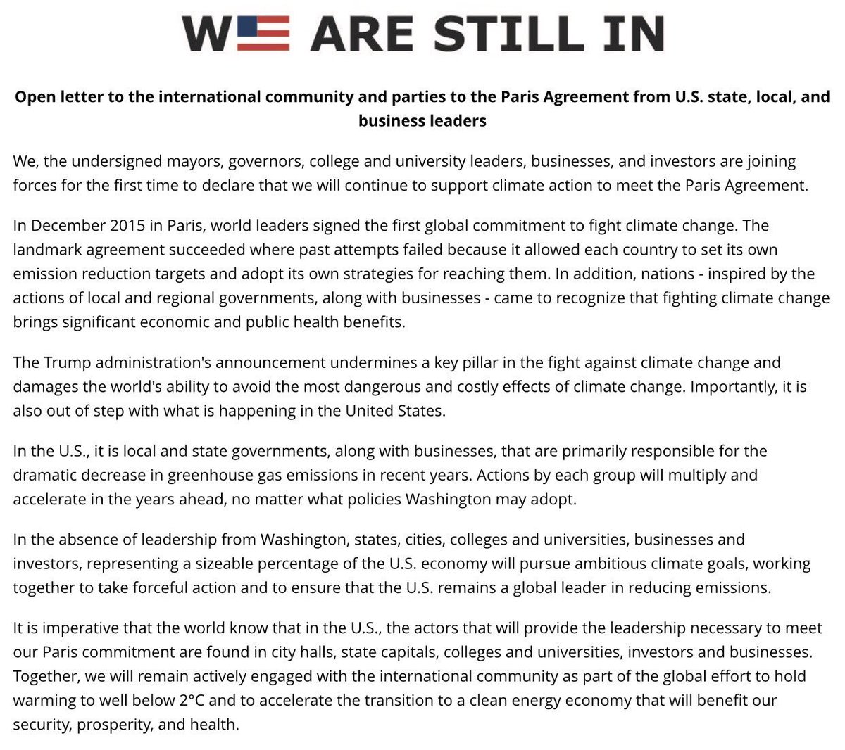 We're joining forces to declare that we will continue to support climate action to meet the Paris Agreement. http://www.wearestillin.com pic.twitter.com/glyyr8Xs41