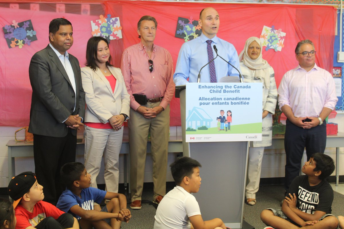 Pleased to join Minister @jyduclos and my colleagues at @FairglenJrPS this morning to announce that from tomorrow, #CanadaChildBenefit cheques are getting bigger, two years ahead of schedule. This is great news for families and a hallmark achievement for our government. #cdnpoli pic.twitter.com/cNyEZJsOyI