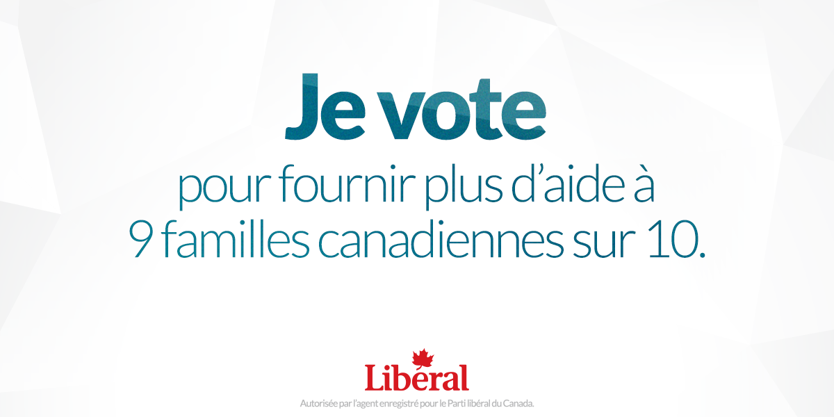 Je vote pour #changerensemble car le plan de @JustinTrudeau donne + d'argent à 9 familles/10 que celui de Harperpic.twitter.com/otSX13AS41