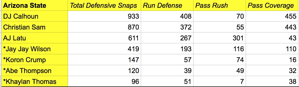 #ASU allotted its linebacker snaps in 2017, according to Pro Football Focus. (*indicates returning players) In article, you can compare it with how SDSU — where ASU DC Danny Gonzales arrived from — split LB reps.pic.twitter.com/IWFqF9ZqME
