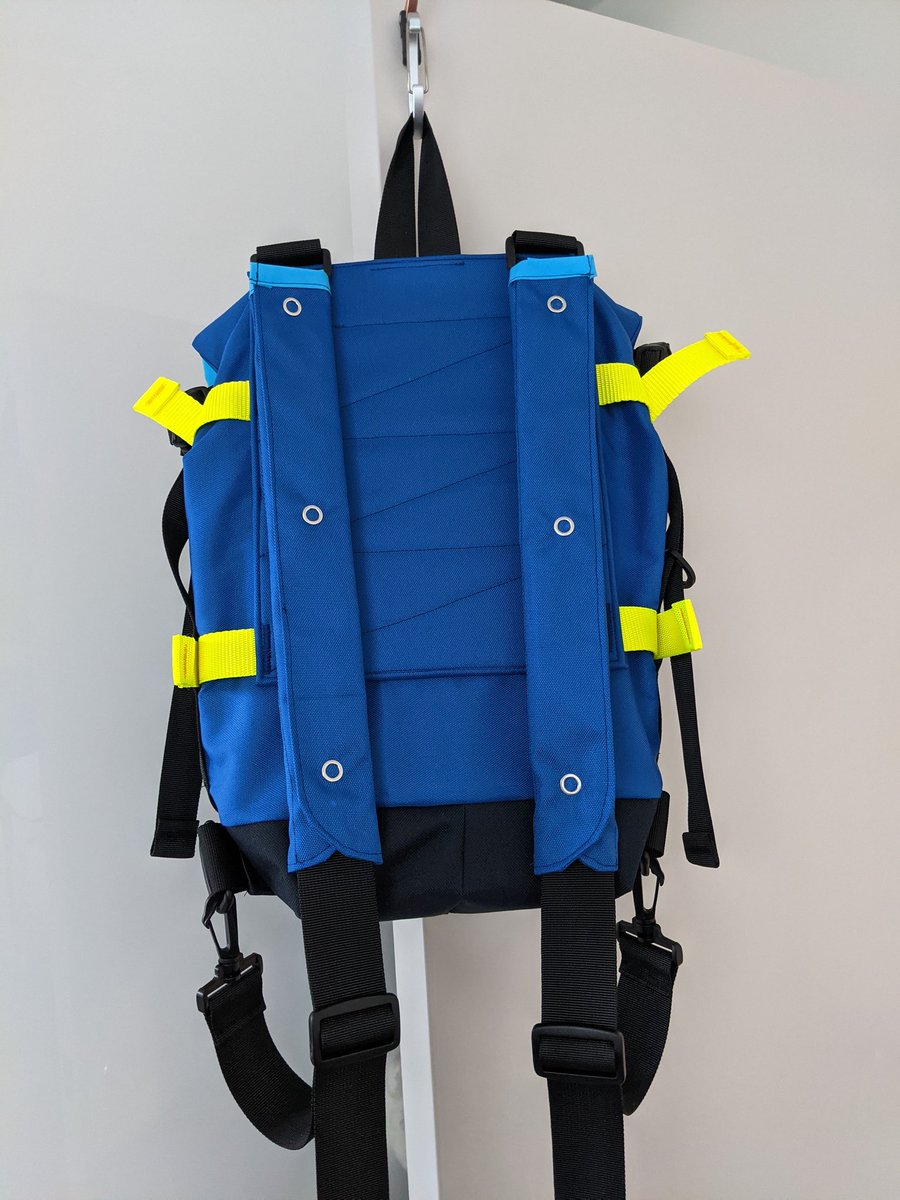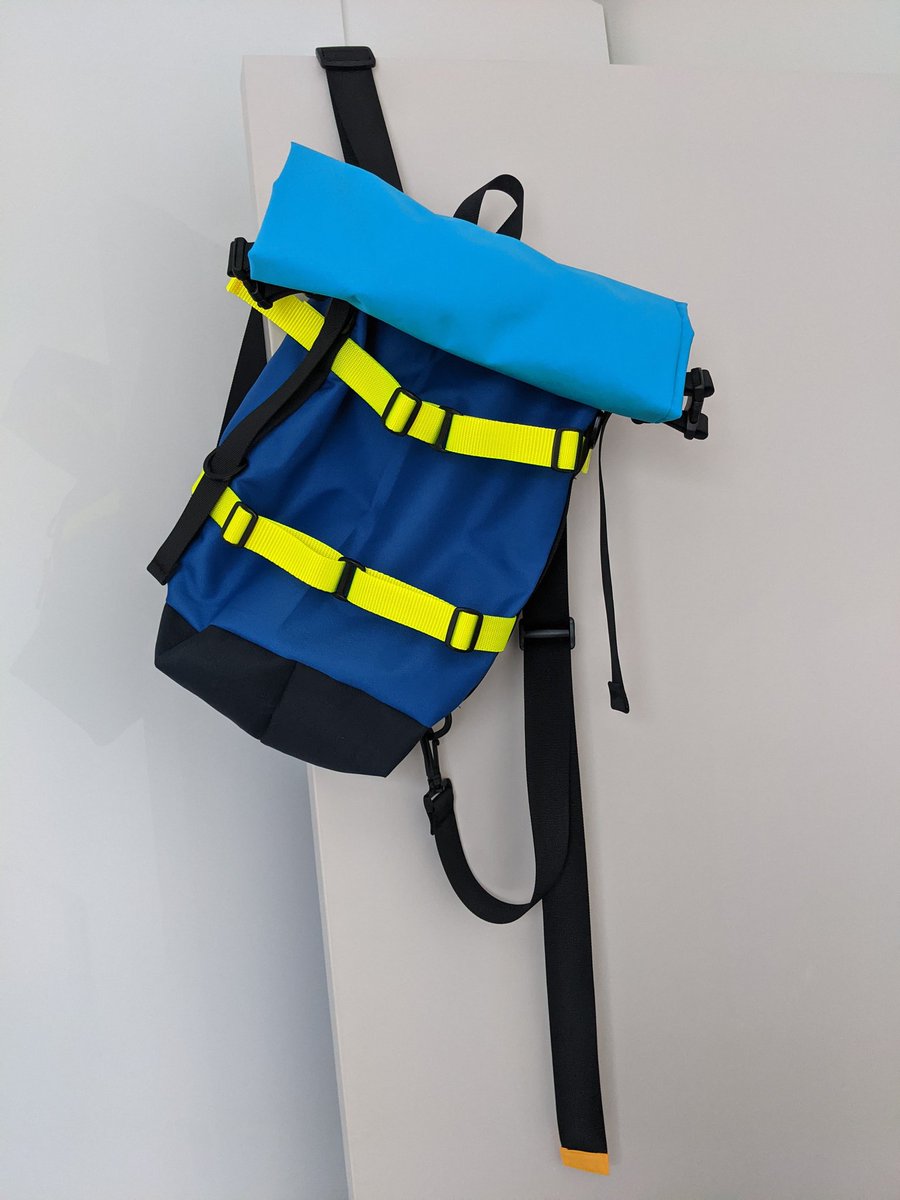 I finished this the other day. Apart from making a big, but not terminal error, quite happy about it. Rollover backpack, snap-on strap padding, and compression straps in an IKEA inspired colourway, from my own pattern.pic.twitter.com/b5bhsBIlIP