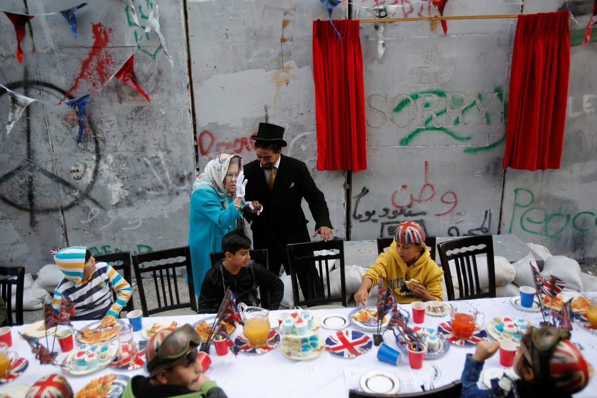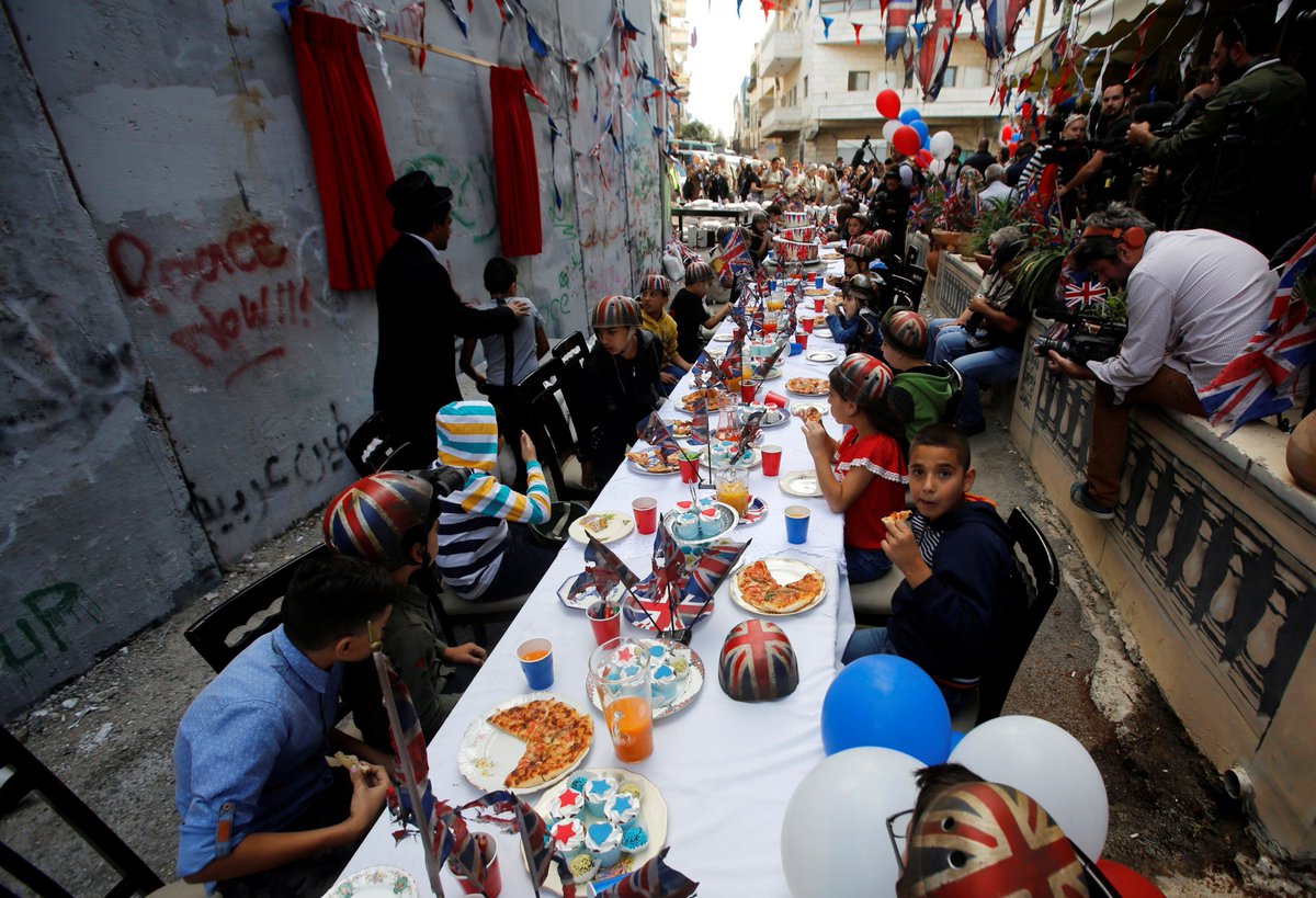 Banksy hosts mock tea party in West bank with fake Queen Elizabeth II to say "sorry" from Britain on