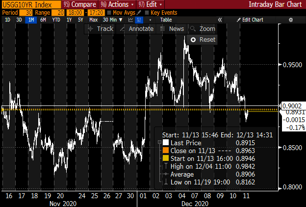 10-year Treasury yields back below 0.9% and reached the lowest since the morning of Dec. 1, which was just before that $908 billion bipartisan stimulus proposal came out.pic.twitter.com/Jd2VqsoMs4