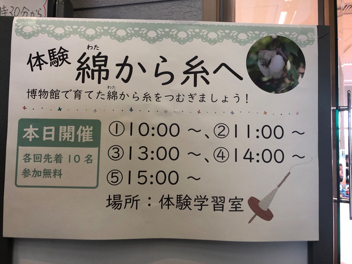 【体験イベント 綿から糸へ】 本日、博物館で育てた綿から糸をつむぐ体験イベントを開催中。午後は13時、14時、15時に行います。各回先着10名様。この機会に、糸をつむいでみませんか?参加無料!pic.twitter.com/Q5osagwiVg
