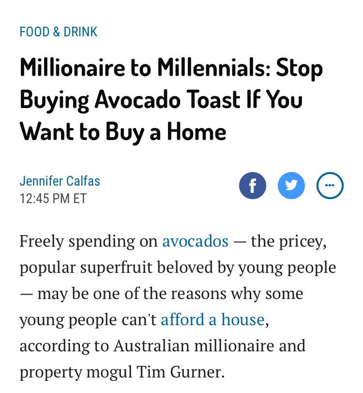 some idiot thinks that millennials can't afford to buy homes because they buy avocados too often and smear them on toast