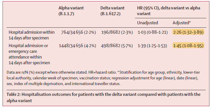 This study found two-fold increased risk of hospitalisation for Delta variant It suggests Delta is not only more infectious, but also potentially more virulent. The good news is that immunity through vaccines seems to mitigate any additional harms inherent to the virus