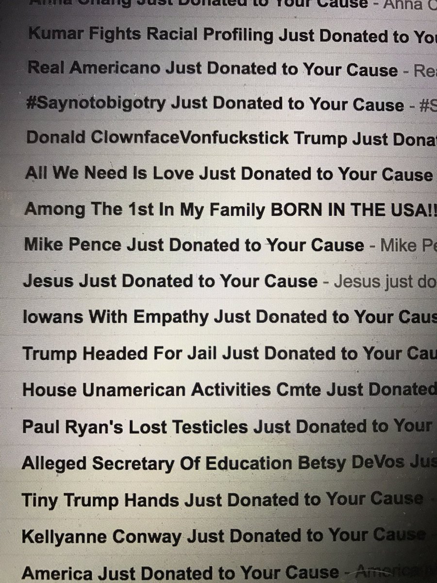 these donor names you guys are using are both funny & moving. Faves so far: kellyanne conwoman, refugees welcome, & Donald trump