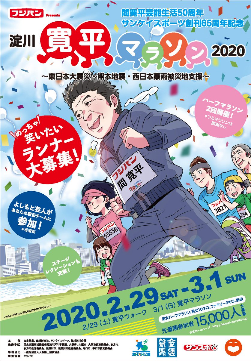 2020年3月1日、淀川河川公園および淀川河川敷で開催いたします\(^o^)/ 『淀川 寛平マラソン2020』の"めっちゃ笑いたいランナー"を大募集しております!! http://ow.ly/H2lx30pThbd pic.twitter.com/EfsHjVhboP