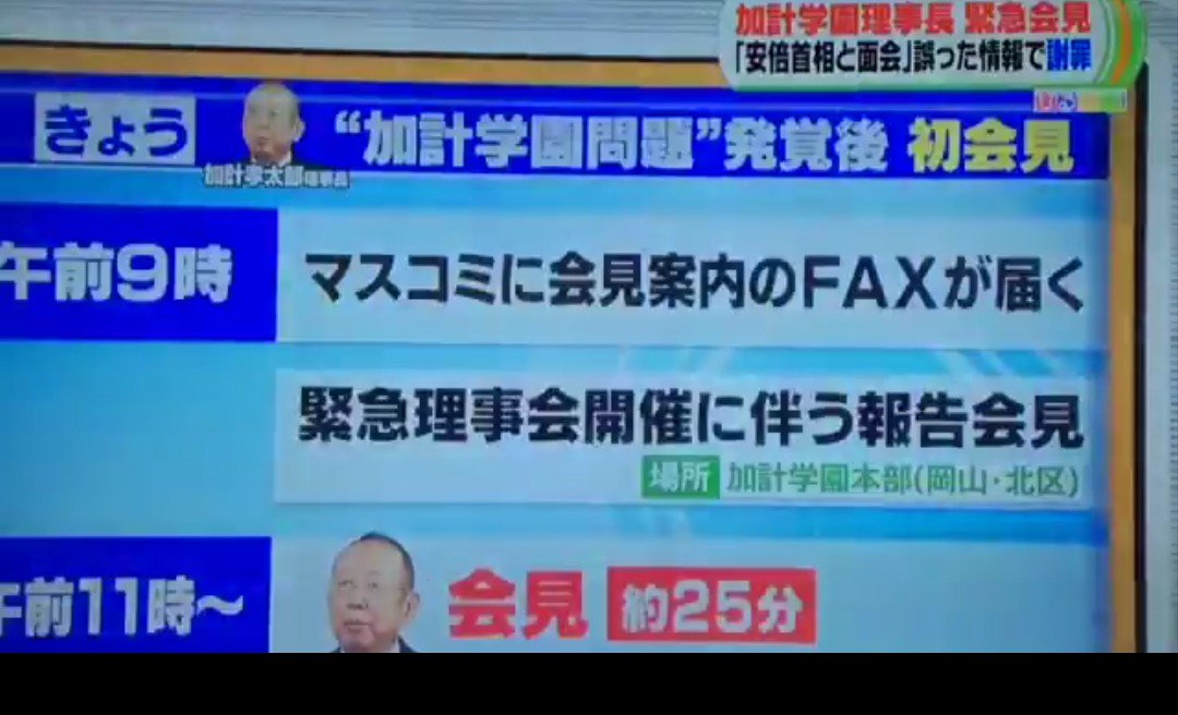 #加計理事長 会見のお知らせは今朝の9時12分に岡山の地元のメディアだけにファックスを流した。9時12分にファックスを流して11時から会見をしますと。つまり東京からは来れない時間を狙った。でも、報ステのクルーが大阪の地震を取材に来てて、会見場に行ってギリギリ間に合ったが取材拒否。pic.twitter.com/0EUVSFzDLM