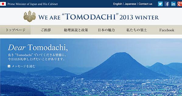 @kantei 首相官邸ホームページには、まだこちらへのリンクが表示されてませんよね?たくさんの他国の方々に見てもらえるよう、関係する各省すべてにリンク表示してもらった方が良いと思います。日本の情報や主張の発信は大賛成です。これからも頑張って下さい!応援しています\(^o^)/