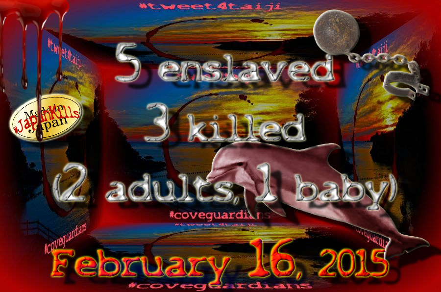 @kantei TAIJI. 2/16/15. Bottlenose dolphins: 5 enslaved, 3 killed (2 adults, 1 baby). @CoveGuardians#二次元キャラ出るまで50音pic.twitter.com/hTkhcAp5Gj