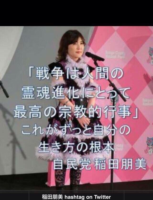 稲田の防衛相起用 11月からの駆け付け警護実施と ヒタヒタと近づく戦争の足音 平和安全法制とやらが紛れもなく 戦争法であることの証明 この危機に公明は沈黙を守り 平和の党が日本会議に集う 靖国神社らと共に政教一致の カルトに化けた瞬間だ!