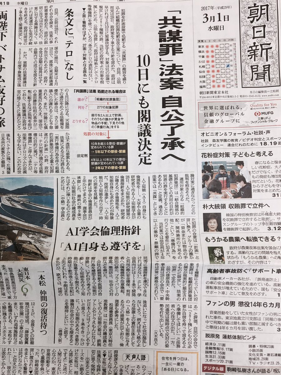 @jimin_koho 閣議決定の共謀罪に成立反対を 国民のひとりとして訴えます 1日付朝日朝刊でもテロ対策との当初の主旨を大きく脱落しているとの 矛盾が指摘されています。 他方で首相の答弁も曖昧で何処まで が青線なのか?線引きがしっかりと されておりません!pic.twitter.com/y2xygidYnf