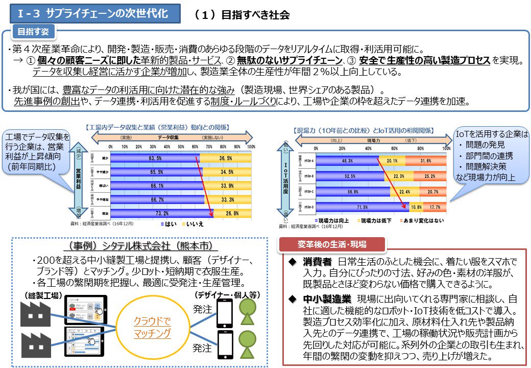 【 #未来投資戦略2017 :サプライチェーンの次世代化】自宅で、街中で、ふとした機会にスマホに自分の好みを入力して、世界中の服を「試着」!?自分にぴったりの寸法、好みの色・素材の洋服が購入できるように!pic.twitter.com/v1l90tsXgO
