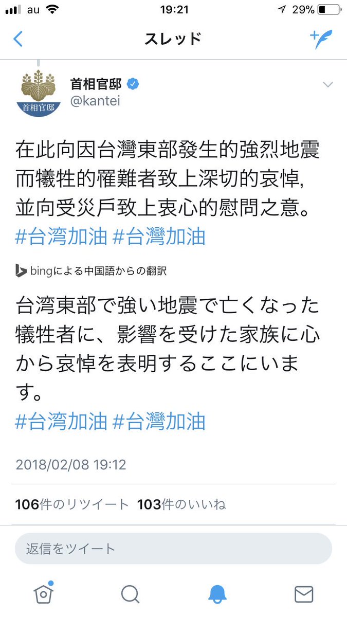 すげえ、翻訳したら問題なく翻訳できた。 被災した台湾のいち早い復興をココロからお祈り申し上げます。 #台湾加油pic.twitter.com/EfMiGzVF9x