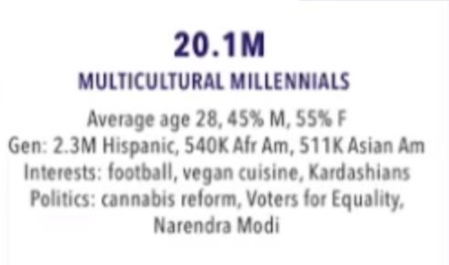 Some of these Facebook segments are quite interesting: "Multicultural Millennials" are liberal, like weed, football, Modi & Kardashianspic.twitter.com/llgAajmOaf