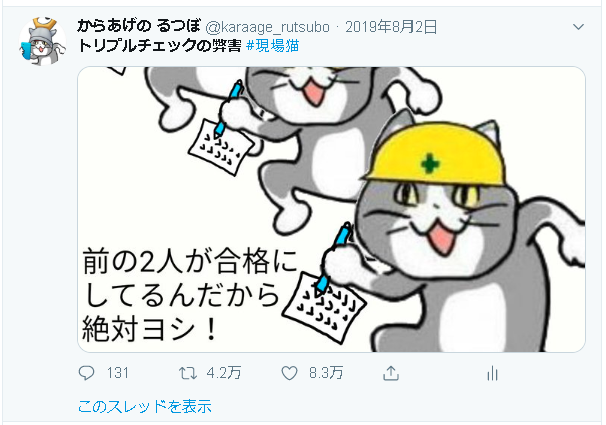 自分は本家や公式じゃなくてただの一般コラ職人なので、フォローするならくまみね先生をフォローヨシ! 「◆◆◆現場猫の経緯/本家さまキャラ/公式グッズなど」https://twitter.com/i/events/1188263608683089920 …