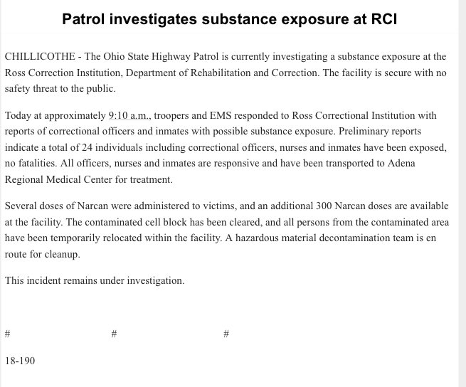 .@OSHP investigating situation at Ross Correctional Institution - 24 people treated w Narcan for “possible substance exposure”. No fatalities.pic.twitter.com/fPG4rSUzsA