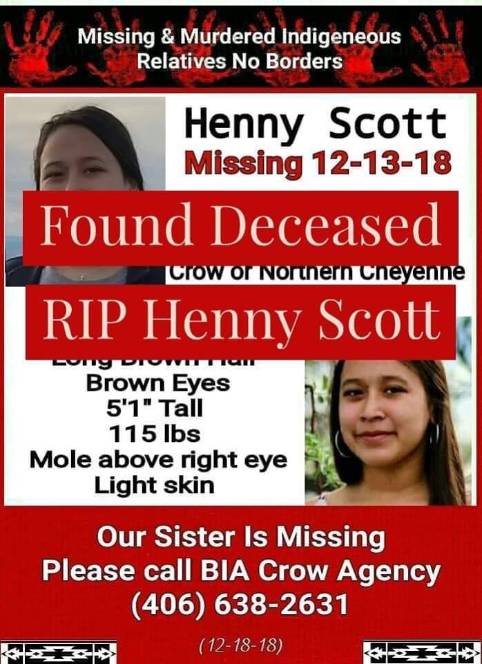 Henny Scott disappeared 12/13. Missing/Endangered Person advisory did not go out until 12/27. Over a dozen Native women disappeared in Montana in 2018. Indigenous women & girls are murdered @ 10x the national rate. 84% experience violence.