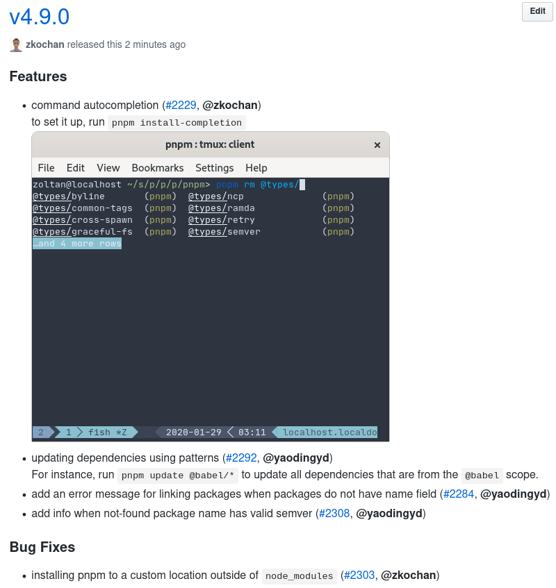 pnpm v4.9 will have command completion in bash, zsh and fish! Commands, options, script names, dependency names will be autocompleted.pic.twitter.com/ksvns9DxNi