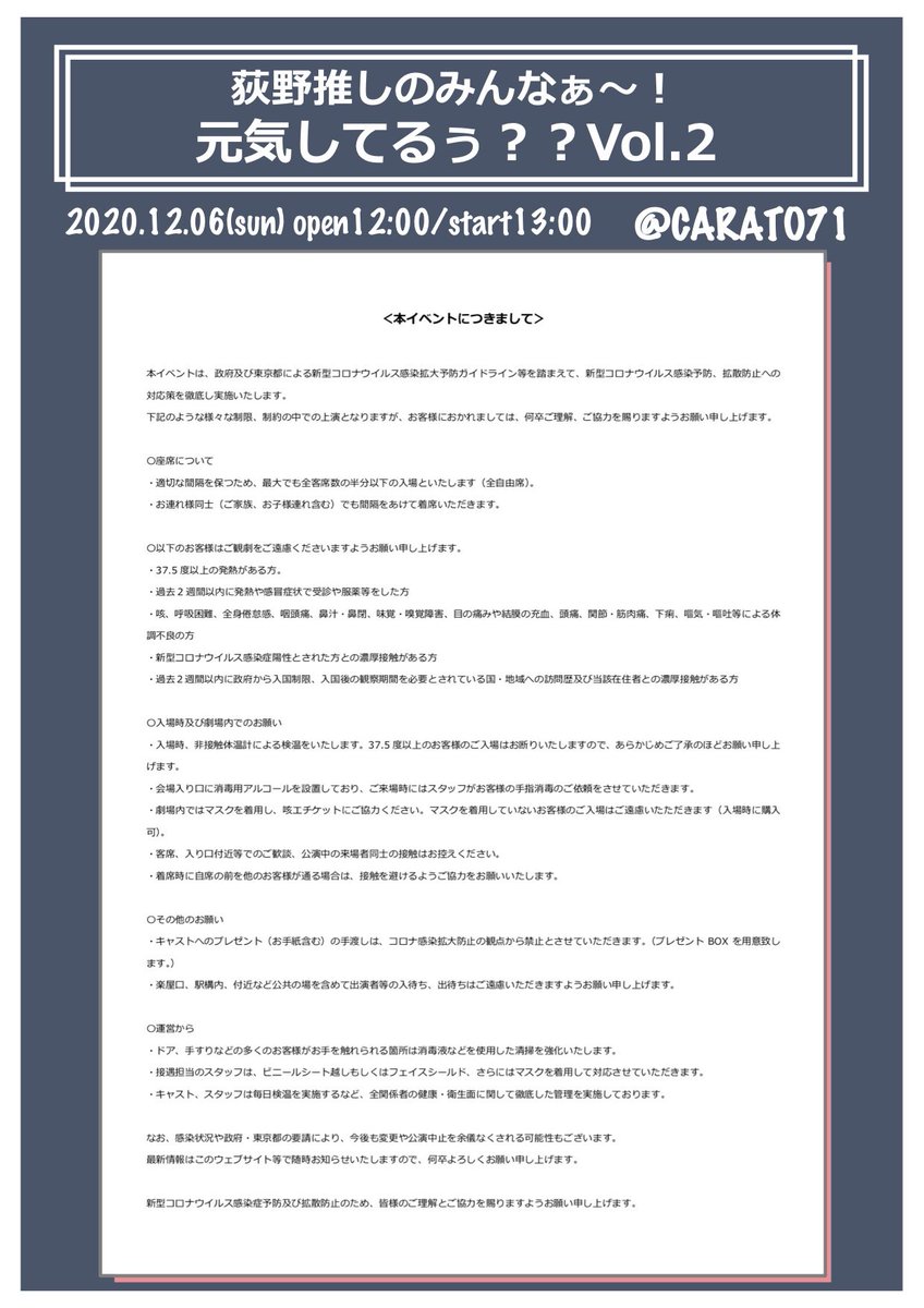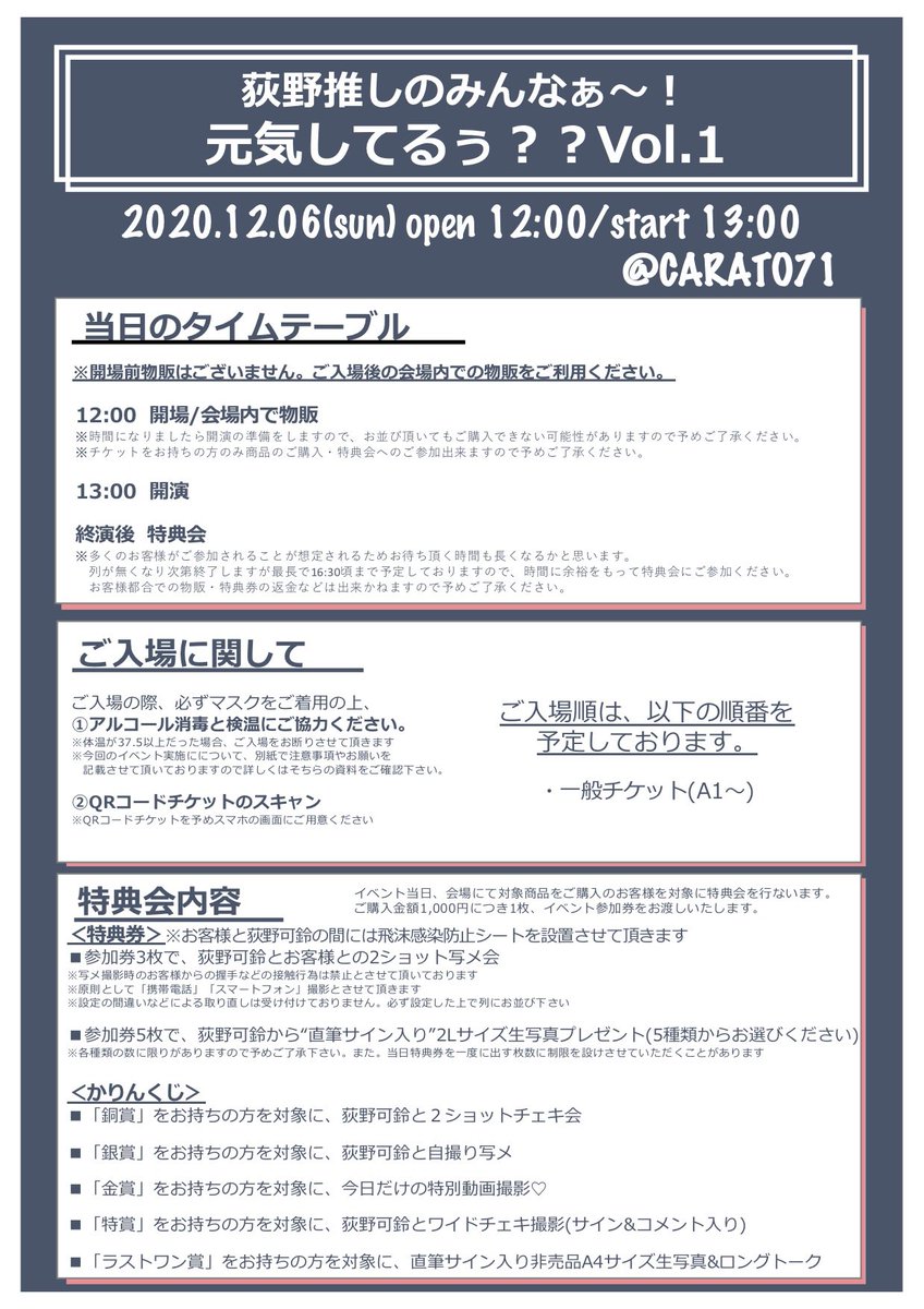 先日日程はさりげなく発表しましたが詳細です〜! 「荻野推しのみんなぁ〜!元気してるぅ??Vol.2」 日程:12/6(日)13時開演 場所:CARATO71 (カラート71) チケットの販売は、明後日22日(日)の18時より開始! https://t.livepocket.jp/e/9eo__ 今回も先着なのでお早めに