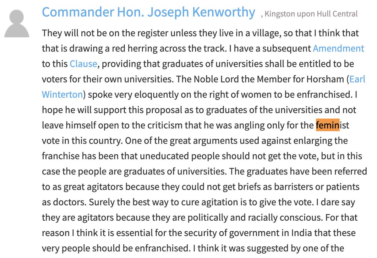 "Feminist" was first spoken in HOC in 1919 - in rather a compelling and interesting speech, actually! https://twitter.com/IanGReeve/status/1332102642651308034 …pic.twitter.com/cjBFhXx1P3