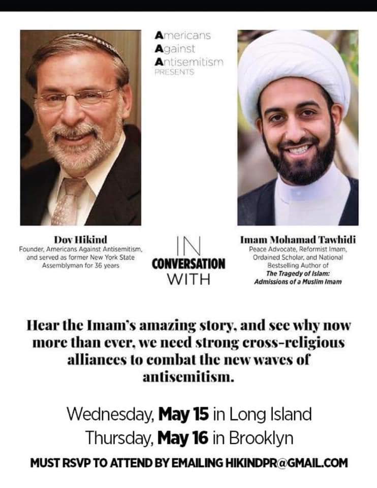 I want to make a suggestion to Brooklyn Jews.Instead of going to this ridiculous event on May 16th with @Imamofpeace & @HikindDov go to the Interfaith iftar also in Brooklyn on that day & really fight Antisemitism & Islamophobia instead of increasing it.https://www.eventbrite.com/e/interfaith-iftar-dinner-tickets-60738392166?aff=efbeventtix …