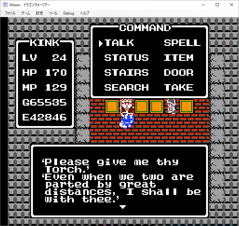 DragonWarrior1で姫を城に連れ帰り「王女の愛」をもらおうと思ったら、持ち物がいっぱいだったらしく姫に「たいまつ」を奪われた…。ていうか兵士が王女と合体した…。おぅ…。pic.twitter.com/9CoIN7wANT