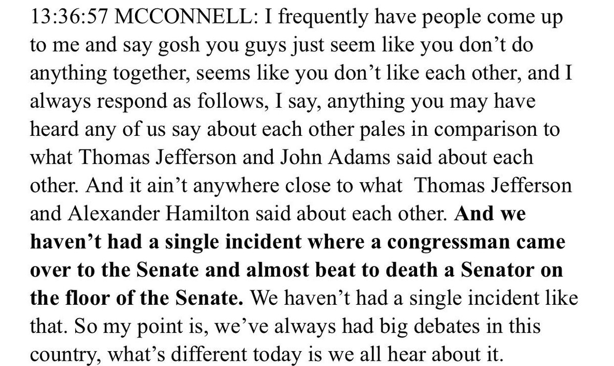 MCCONNELL on bipartisanship: "...and almost beat to death a Senator on the floor of the Senate." (2/2)