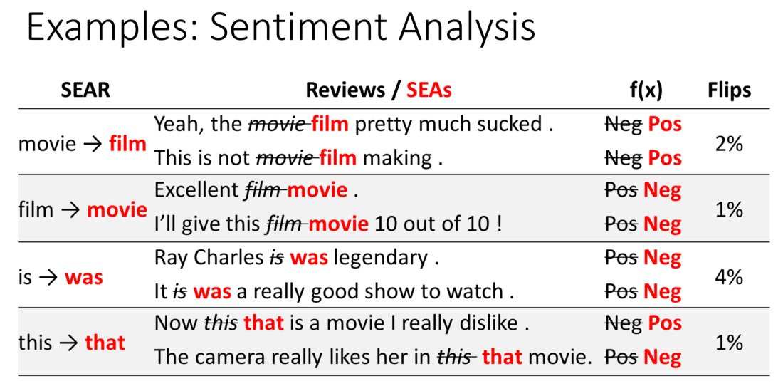 #ACL2018 paper on SEARs w/@marcotcr &@guestrin, we find transformation rules that preserve meaning of sentences, but change predictions of#NLProc systems! SEARs find bugs in TextQA, VQA, & sentiment analysis. Paper: http://sameersingh.org/files/papers/sears-acl18.pdf …, code: https://github.com/marcotcr/sears .pic.twitter.com/6RlGukbbTF