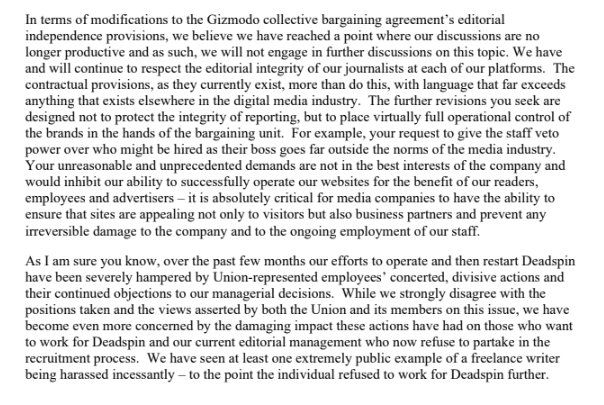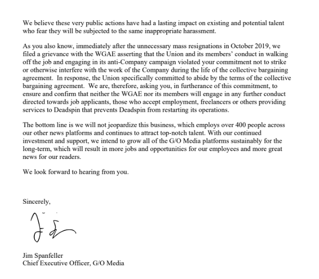 News: G/O Media is moving Deadspin to Chicago and suspending negotiations with unionized employees. Here's the letter from Jim Spanfeller. pic.twitter.com/x3ymCOCbmI