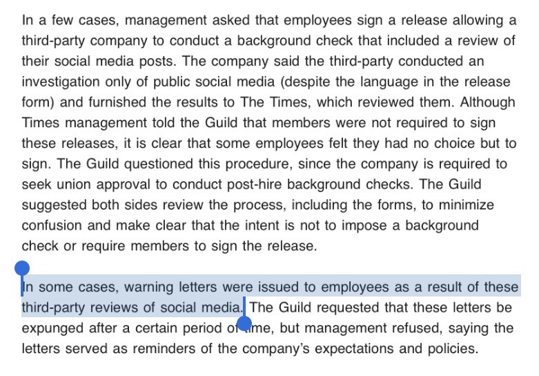 recently, the @nyguild met with the NYT on how to better protect journalists from harassment. The guild had found that the NYT sometimes responded to harassment of its own journalists by authorizing background checks on those journalists and warning them about their own tweets.pic.twitter.com/mRTfPlI88p