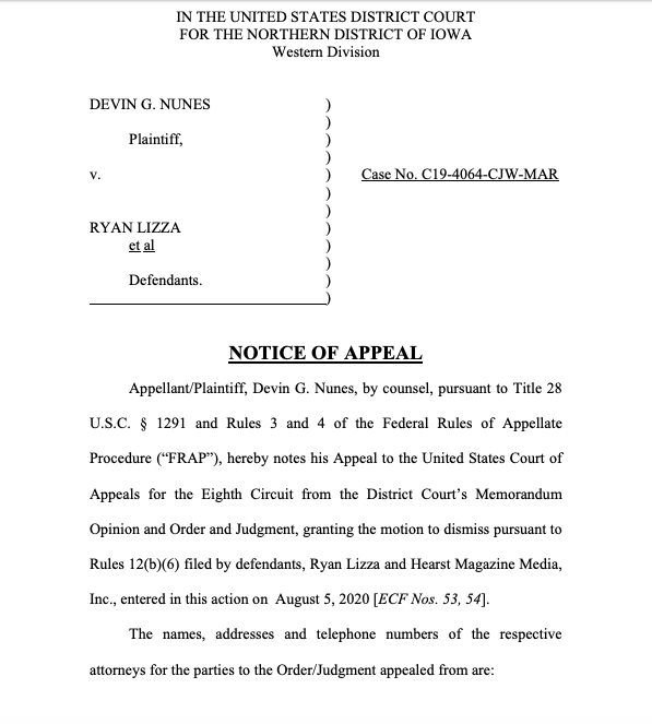 Additionally, Nunes today filed to appeal an Iowa judge's decision to dismiss his lawsuit against