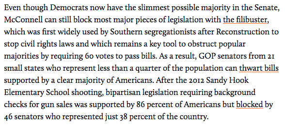 After Sandy Hook shooting in 2012 bipartisan legislation requiring background checks for gun sales was supported by 86% of Americans & 54 senators but blocked by 46 senators representing just 38% of country This is why we need to abolish filibuster https://www.motherjones.com/politics/2021/01/the-insurrection-was-put-down-the-gop-plan-for-minority-rule-marches-on/ …pic.twitter.com/JR6zDXHcs4