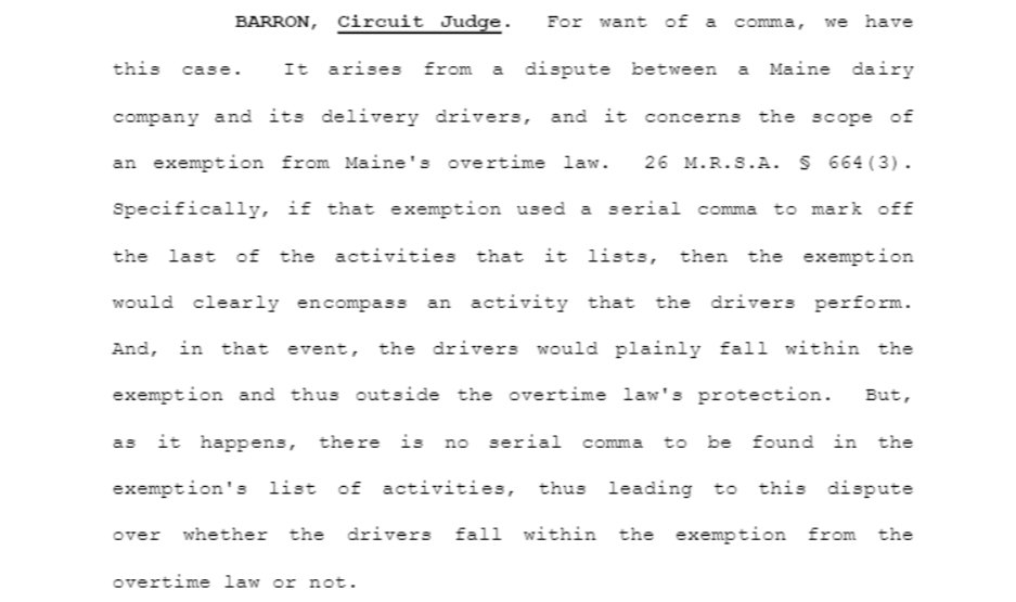 "For want of a comma, we have this case." Judge decides Fist Cir Court case based on ever-important Oxford comma http://cnn.it/2nnQHhu pic.twitter.com/XsFfHKMYMG