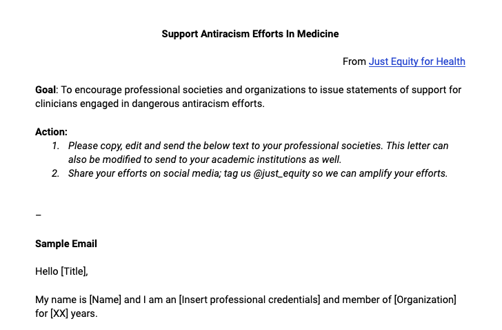 For those disturbed by white supremacists targeting docs doing important health equity work, we have some ACTIONS you can take, today. First, send this email to your professional societies to issue a statement of support. 1/ https://tinyurl.com/ycku93cw pic.twitter.com/7QE11dBTB5