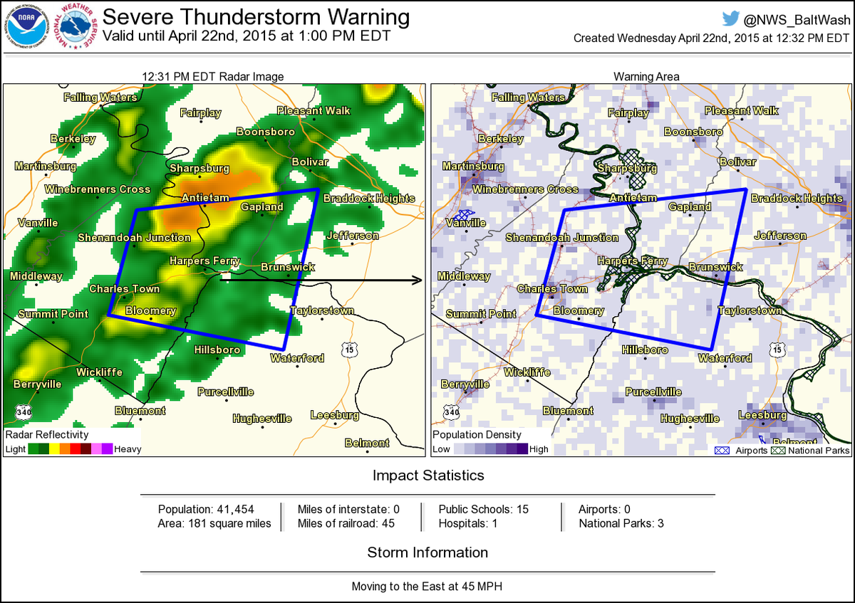 Severe Thunderstorm Warning including Charles Town WV, Harpers Ferry WV, Ranson WV until 1:00 PM EDT pic.twitter.com/pM42VGhsZn