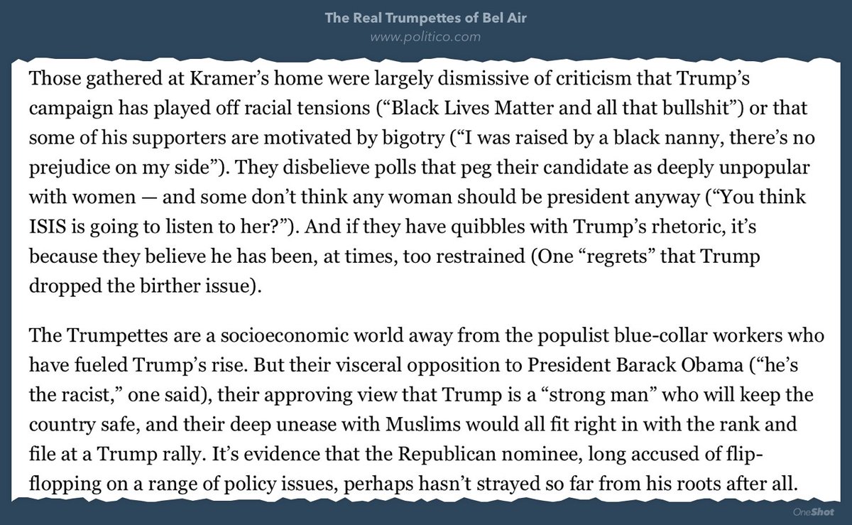 Catching up on @katieglueck's exploration of Deplorable Rich People for Trump. http://www.politico.com/magazine/story/2016/09/donald-trump-2016-trumpettes-bel-air-214206 …pic.twitter.com/W39iUlWMFy