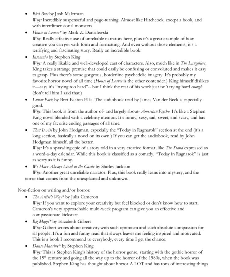 @katielwright is teaching her first horror workshop starting this Saturday, and this is the recommended reading list she is providing her class@haszombiesinit@hodgman@PlanetofFinks@StephenKing@BEEs_Assistant@BretEastonEllis@GilbertLizpic.twitter.com/HgoEiBpcEF
